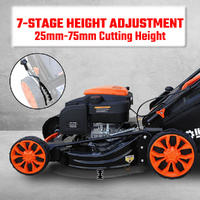 7-stage height adjustment: easily set the perfect cutting height (25–75 mm) with a single lever.