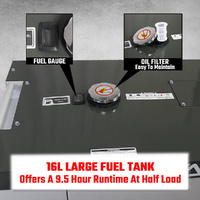 16L large fuel tank: offers up to 9.5 hours of runtime at 50% load