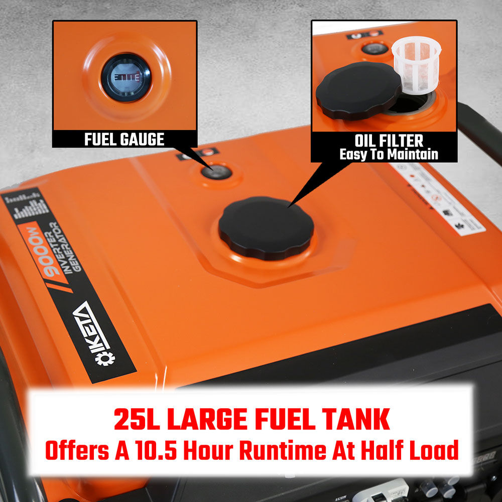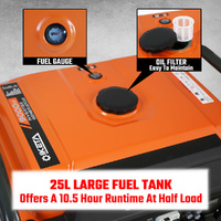 25L large fuel tank: offers up to 10.5 hours of runtime at 50% load